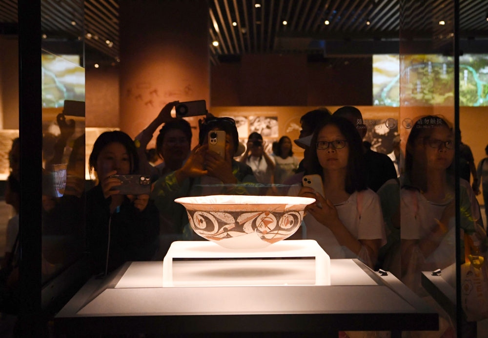 2025年6月14日,參觀者在大河村遺址博物館新館觀看展品。新華社記者 郝源 攝