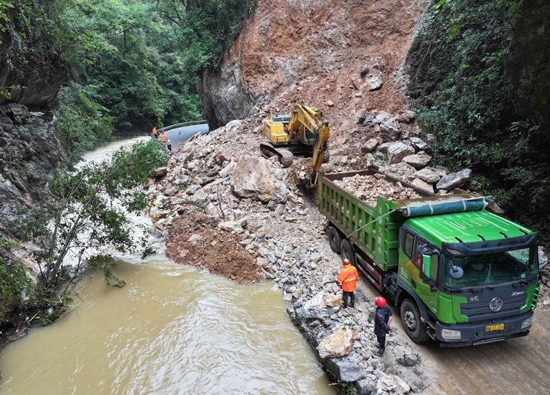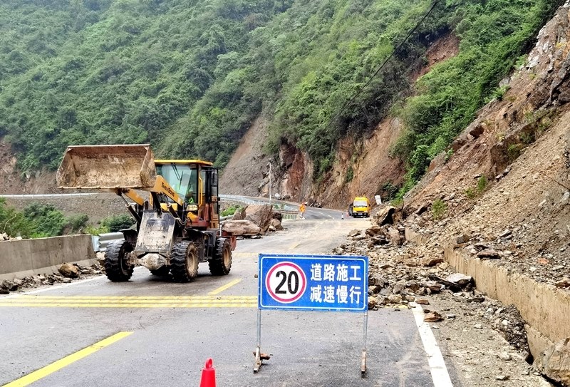 8月10日,在468省道??悼h寺坪鎮(zhèn)升石坪路段,公路養(yǎng)護部門工作人員駕駛裝載機處置路旁垮方。