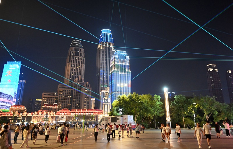 夜幕降臨,海河兩岸燈光璀璨絢麗,熱鬧非凡。市民和游客在天津海河畔漫步休閑,消暑納涼,領(lǐng)略城市光影之美。