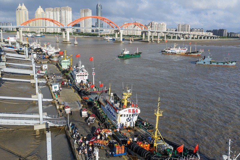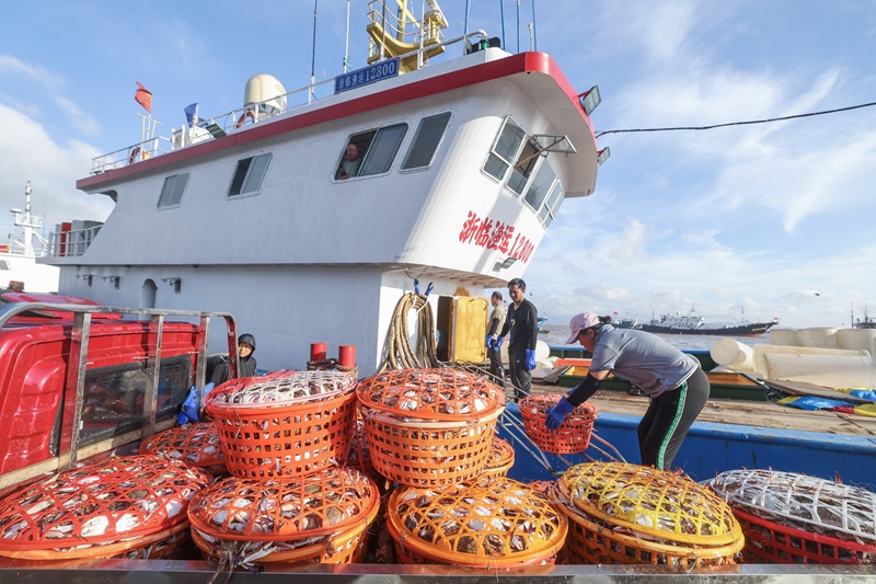 8月12日,開漁歸來的漁運船靠泊在舟山沈家門舟山國際水產(chǎn)城碼頭,漁民把整筐的梭子蟹運送上岸裝車。
