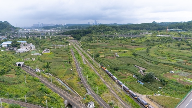 8月19日,貴州首趟多式聯(lián)運“一單制”班列駛出貴陽國際陸港都拉營站(無人機照片)。