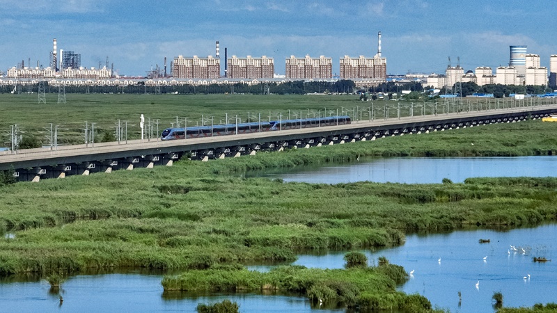 8月17日,復興號動車組列車行駛在哈齊高鐵線上(無人機照片)。