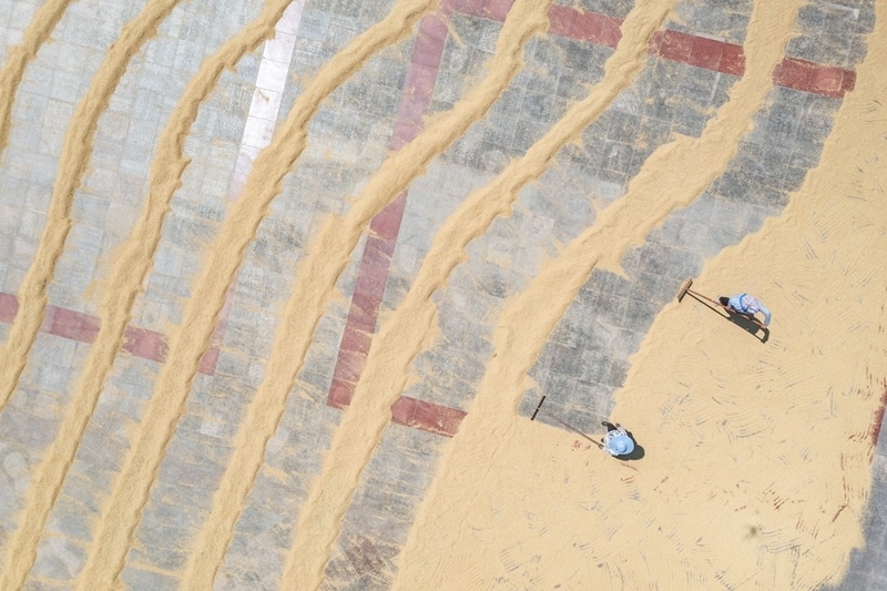 8月20日,人們在重慶市永川區(qū)紅爐鎮(zhèn)政府廣場上晾曬糧食(無人機(jī)照片)。
