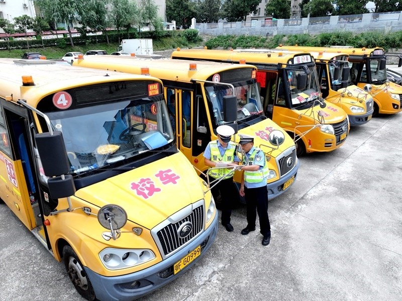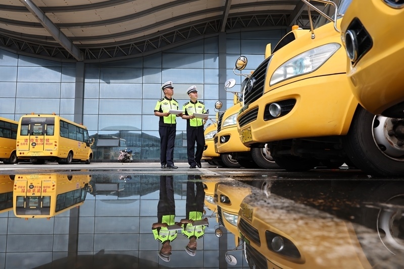 8月25日,湖北省襄陽市保康縣公安局交警大隊民警對校車進行安全檢查(無人機照片)。