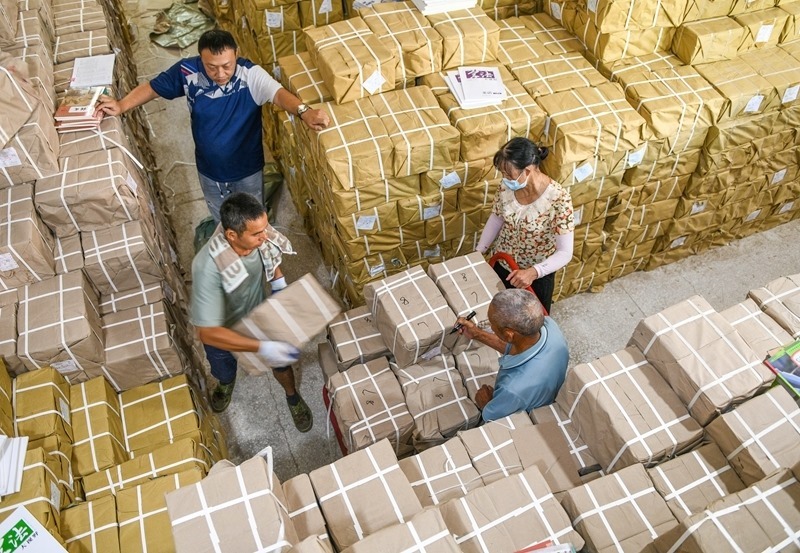 8月25日,在湖南省永州市道縣新華書店倉庫,工作人員在搬運新學期教材。