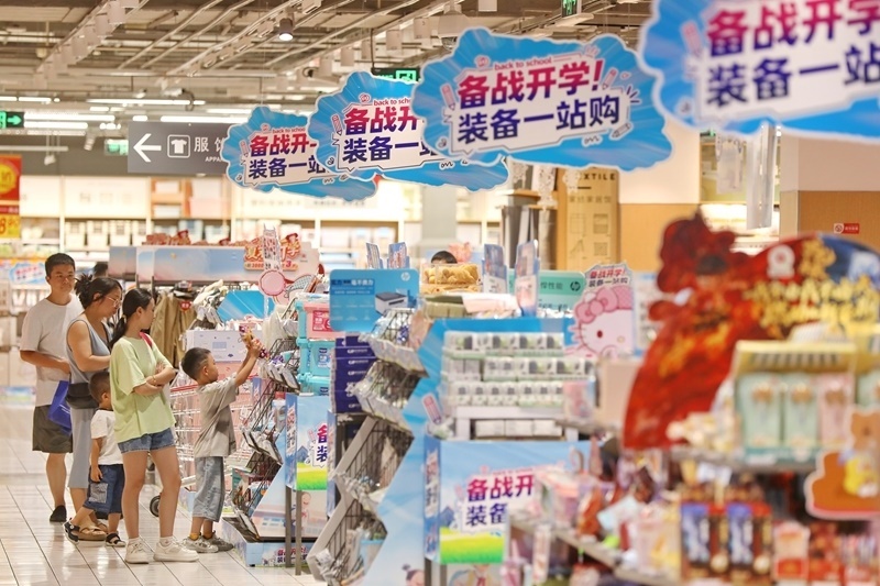 8月24日,在浙江省嘉興市南湖區(qū)一家商場,家長帶著孩子選購學習用品。