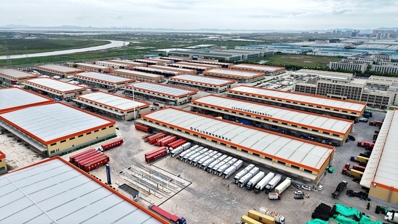 這是位于青島膠州市的中國傳化(上合)國際物流港。該物流港集智能倉儲(chǔ)、零擔(dān)分撥、多式聯(lián)運(yùn)等功能于一體(8月27日攝,無人機(jī)照片)。