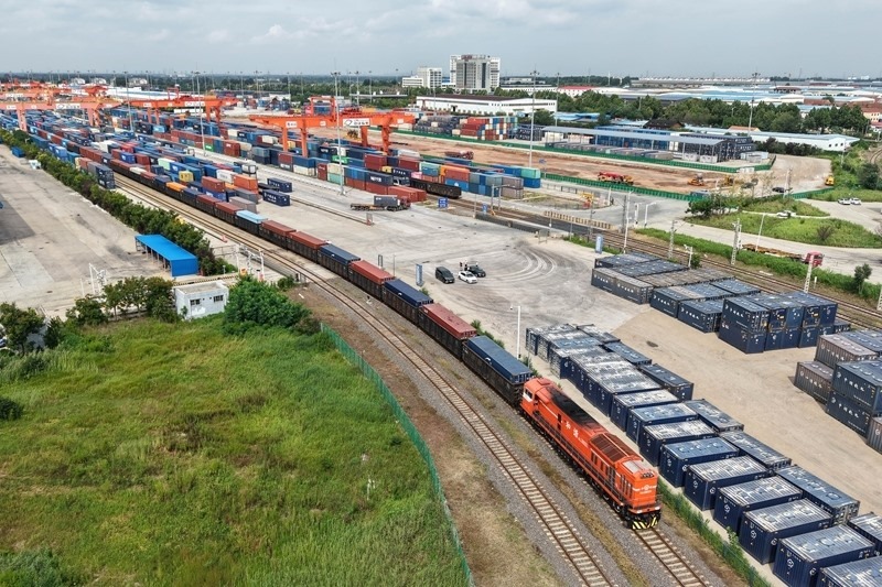8月27日,貨運(yùn)列車駛?cè)胛挥谏虾鲜痉秴^(qū)內(nèi)的中國-上海合作組織地方經(jīng)貿(mào)合作示范區(qū)多式聯(lián)運(yùn)中心(無人機(jī)照片)。