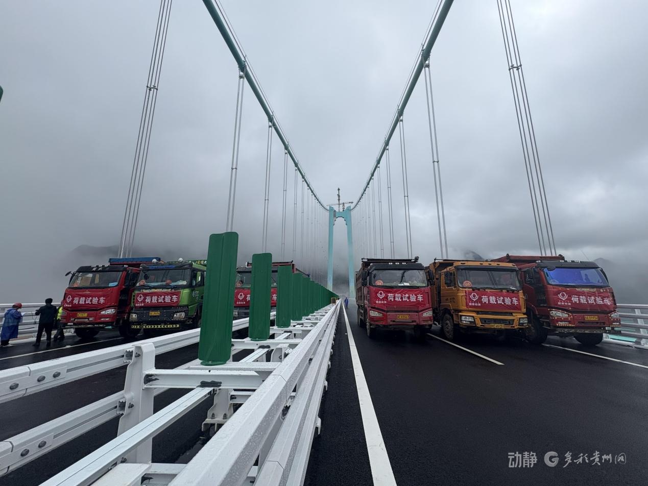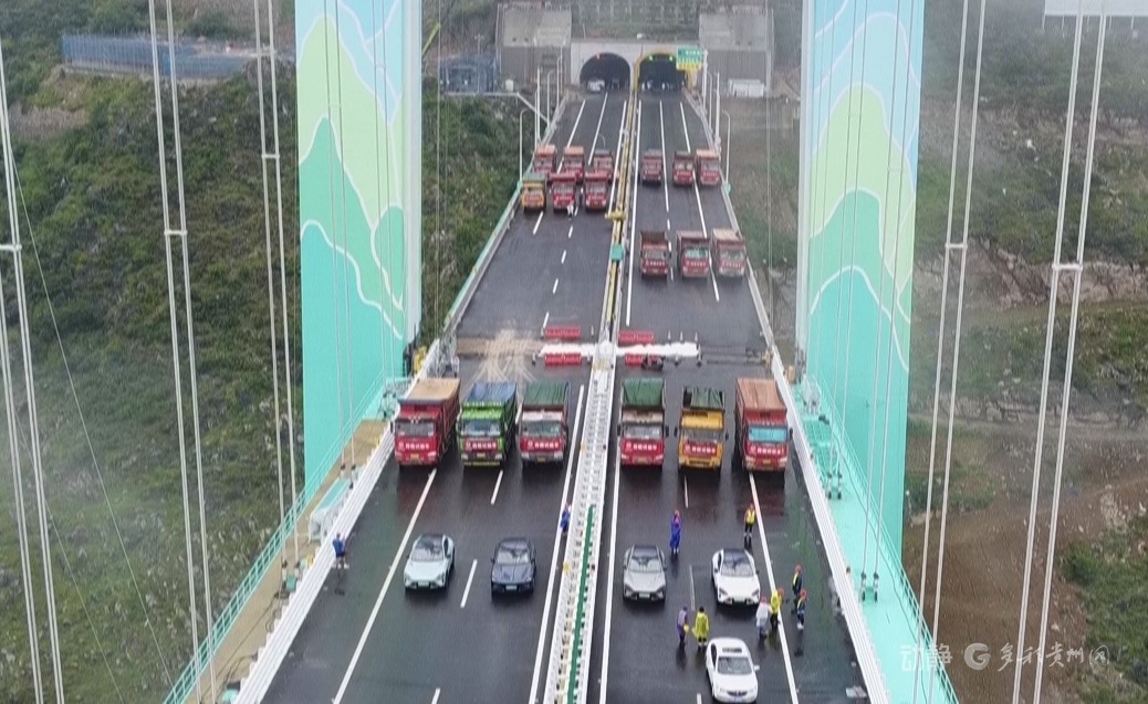 花江峽谷大橋啟動(dòng)荷載試驗(yàn)8月21日,隨著6輛35噸的三軸載重車率先駛上橋面,花江峽谷大橋荷載試驗(yàn)正式啟動(dòng),迎來(lái)通車前的“關(guān)鍵大考”。