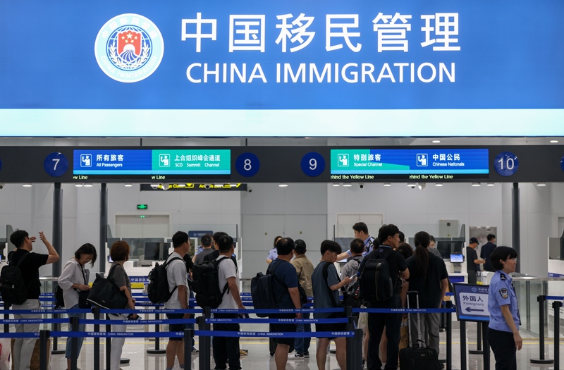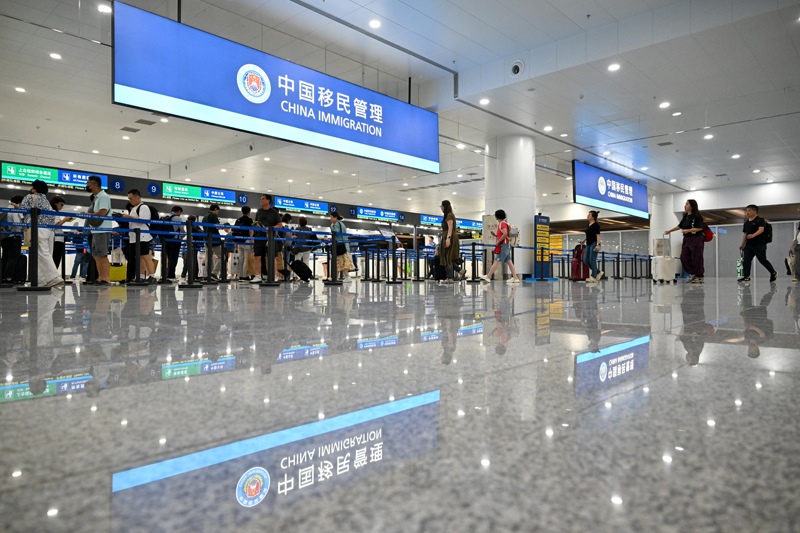 8月27日,在天津?yàn)I海國(guó)際機(jī)場(chǎng)T1航站樓,旅客排隊(duì)入境查驗(yàn)。