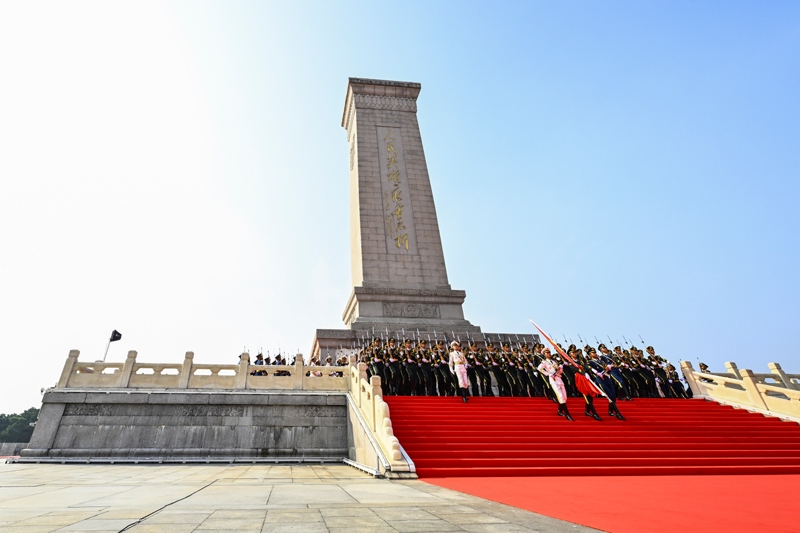 9月3日,紀(jì)念中國人民抗日戰(zhàn)爭暨世界反法西斯戰(zhàn)爭勝利80周年大會在北京隆重舉行。這是國旗護衛(wèi)隊從人民英雄紀(jì)念碑基座出發(fā),走向旗桿基座。