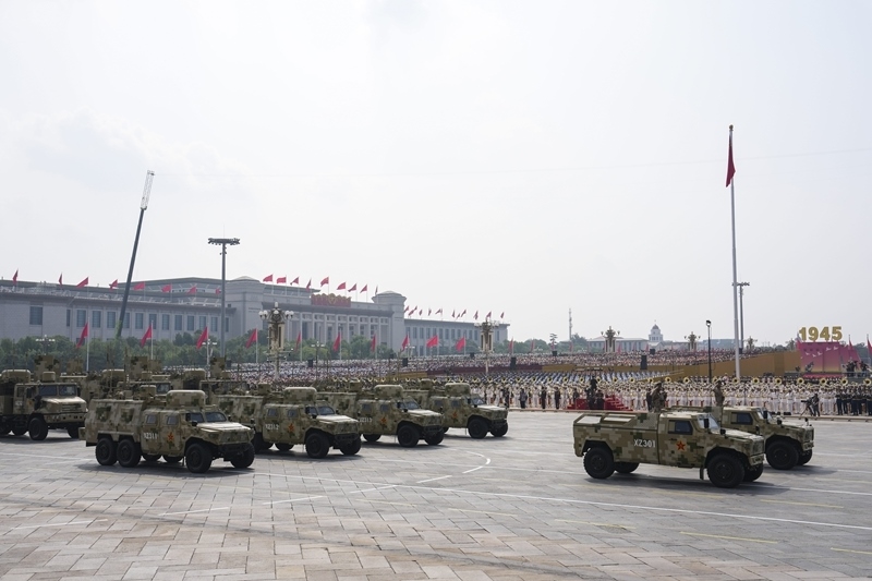 9月3日,紀(jì)念中國人民抗日戰(zhàn)爭暨世界反法西斯戰(zhàn)爭勝利80周年大會在北京隆重舉行。這是裝備保障方隊接受檢閱。