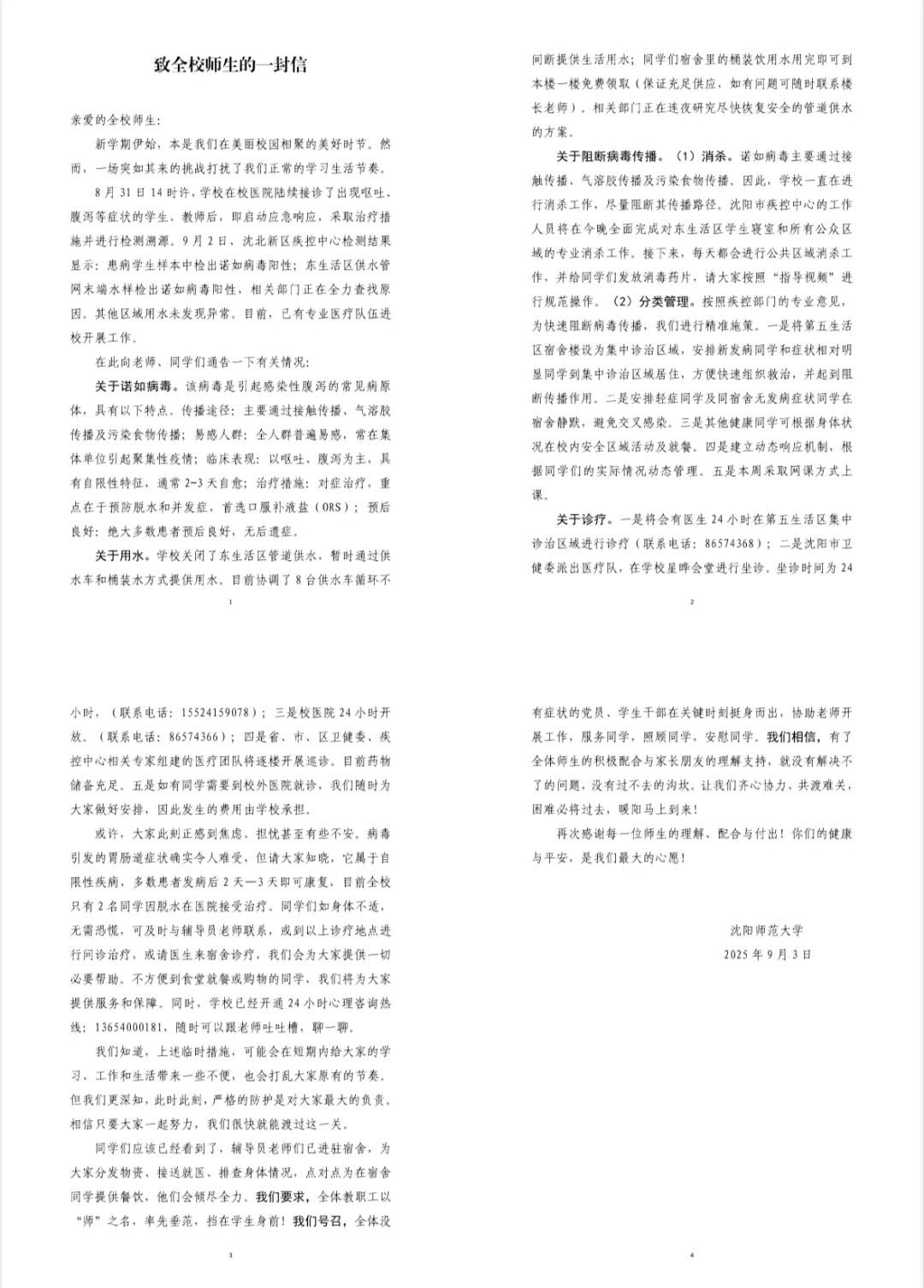 9月3日,沈陽師范大學(xué)發(fā)布的《致全校師生的一封信》(以下簡稱“《一封信》”)中稱,8月31日14時許,學(xué)校在校醫(yī)院陸續(xù)接診了出現(xiàn)嘔吐、腹瀉等癥狀的學(xué)生、教師。相關(guān)部門正在全力查找原因,目前已有專業(yè)醫(yī)療隊伍進校開展工作。