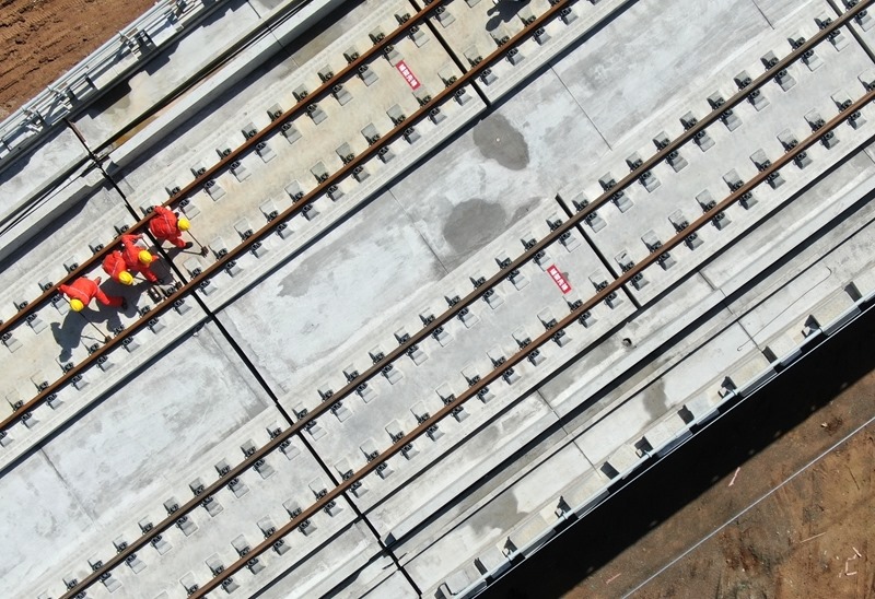 9月8日,施工人員在西十高鐵西安東至藍田區(qū)間鋪設無縫鋼軌(無人機照片)。