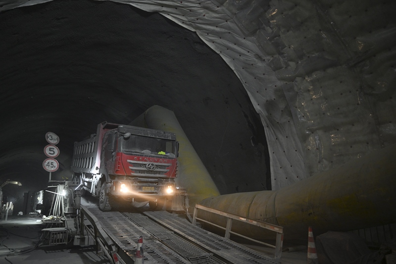 施工車(chē)輛行駛在昭溫公路西天山特長(zhǎng)隧道右洞內(nèi)(10月5日攝)。