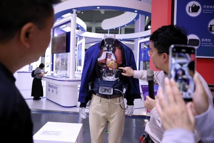 2025年9月24日,在海南博鰲“永不落幕”國際創(chuàng)新藥械展,工作人員為參觀者介紹植入式左心室輔助系統(tǒng)。新華社記者 鄭悅 攝