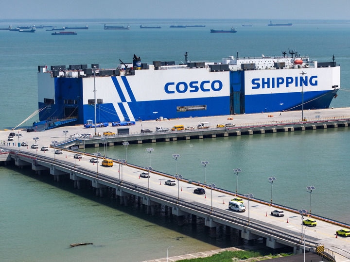 江蘇太倉港,“禮諾運(yùn)輸”號(hào)貨輪載著2600余輛汽車奔赴歐洲,“玉衡先鋒”號(hào)貨輪正將3600多輛國產(chǎn)新車運(yùn)往東南亞。