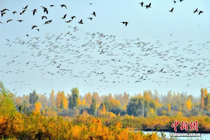 中新網(wǎng)烏魯木齊10月28日電 (黨艷麗)深秋時(shí)節(jié),成群結(jié)隊(duì)的灰雁“到訪”新疆可克達(dá)拉市。它們或飛翔在湛藍(lán)的天空上,發(fā)出陣陣鳴叫聲;或集結(jié)在伊犁河可克達(dá)拉市段河畔,補(bǔ)給“能量”,為接下來的遷徙旅程做足準(zhǔn)備。