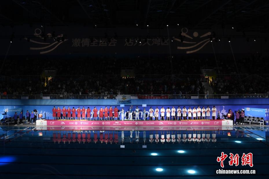 10月27日晚,在廣東廣州舉行的第十五屆全國運動會水球男子組比賽金牌賽中,廣東隊(紅衣)以16比9戰(zhàn)勝上海隊(白衣),獲得金牌。圖為雙方運動員出場。