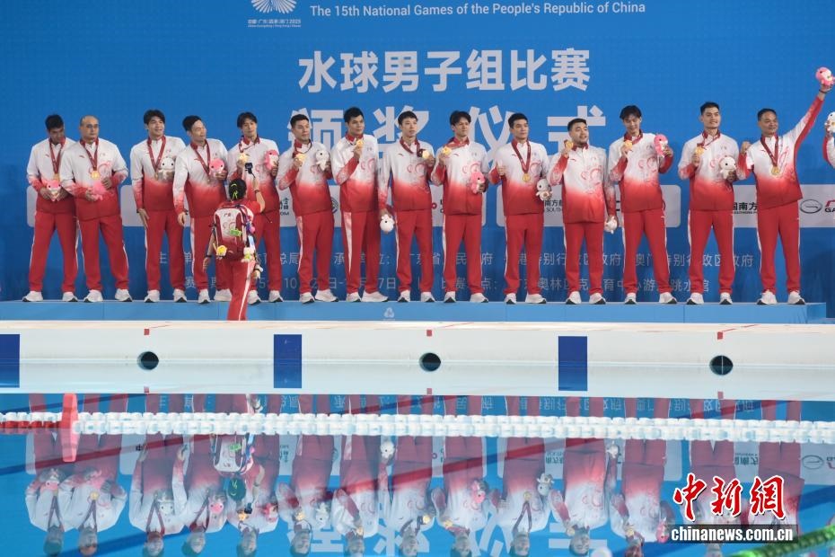 10月27日晚,在廣東廣州舉行的第十五屆全國運動會水球男子組比賽金牌賽中,廣東隊以16比9戰(zhàn)勝上海隊,獲得金牌。圖為廣東隊慶祝比賽獲勝。