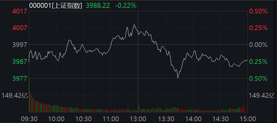 截至收盤(pán),滬指跌0.22%,報(bào)3988.22點(diǎn);深成指跌0.44%,報(bào)13430.1點(diǎn);創(chuàng)業(yè)板指跌0.15%,報(bào)3229.58點(diǎn)。兩市合計(jì)成交21479億元,較上個(gè)交易日縮量約2000億元。