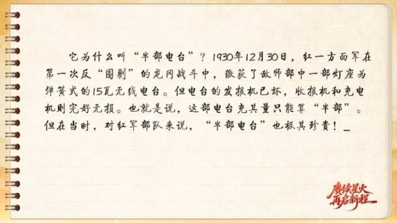 它為什么叫“半部電臺(tái)”?1930年12月30日,紅一方面軍在第一次反“圍剿”的龍岡戰(zhàn)斗中,繳獲了敵師部中一部燈座為彈簧式的15瓦無(wú)線電臺(tái)。但電臺(tái)的發(fā)報(bào)機(jī)已壞,收?qǐng)?bào)機(jī)和充電機(jī)則完好無(wú)損。也就是說(shuō),這部電臺(tái)充其量只能算“半部”。但在當(dāng)時(shí),對(duì)紅軍部隊(duì)來(lái)說(shuō),“半部電臺(tái)”也極其珍貴!