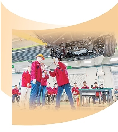 山東水利技師學(xué)院實(shí)訓(xùn)中心,學(xué)生正進(jìn)行整車維修和保養(yǎng)操作。