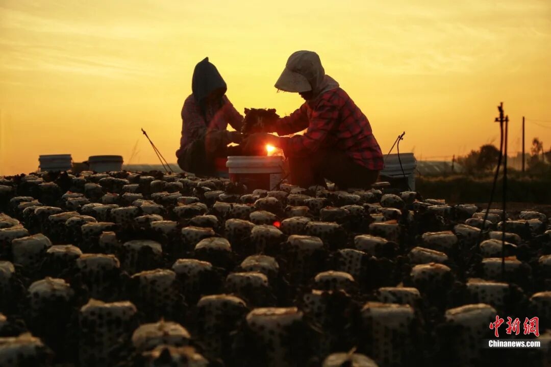 (夕陽(yáng)下,菌農(nóng)們正在采摘。黃松甸鎮(zhèn)供圖)
