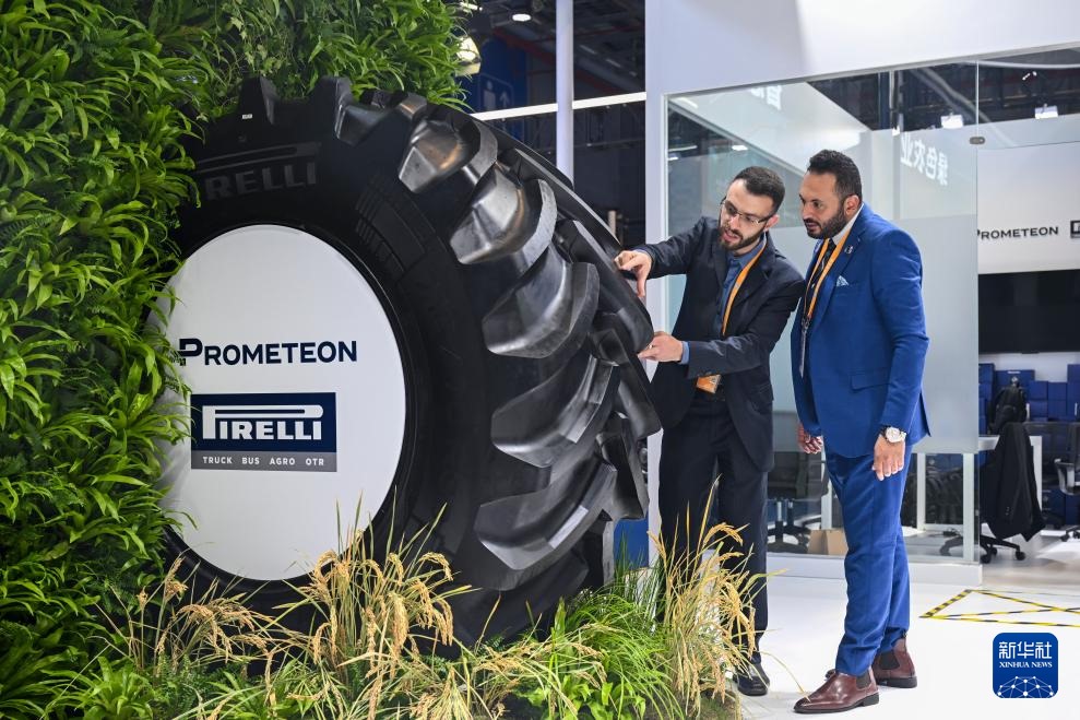 11月6日,在進(jìn)博會(huì)汽車及智慧出行展區(qū)百得安輪胎集團(tuán)展臺(tái),展商在亞洲首發(fā)產(chǎn)品綠色農(nóng)業(yè)輪胎AT02前交流。
