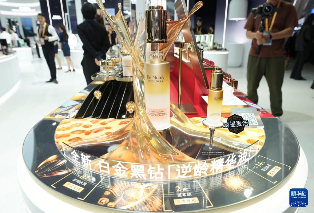 11月6日在進(jìn)博會(huì)消費(fèi)品展區(qū)拍攝的雅詩(shī)蘭黛白金黑鉆逆齡精華油。這是該產(chǎn)品在中國(guó)首發(fā)。