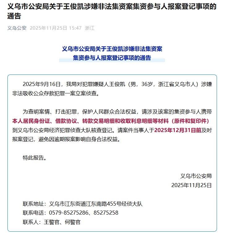 11月25日,義烏市公安局發(fā)布通告:2025年9月16日,我局對(duì)犯罪嫌疑人王俊凱(男,36歲,浙江省義烏市人)涉嫌非法吸收公眾存款犯罪一案立案?jìng)刹椤?/p>