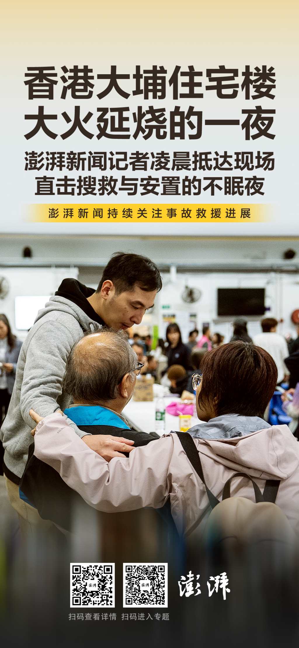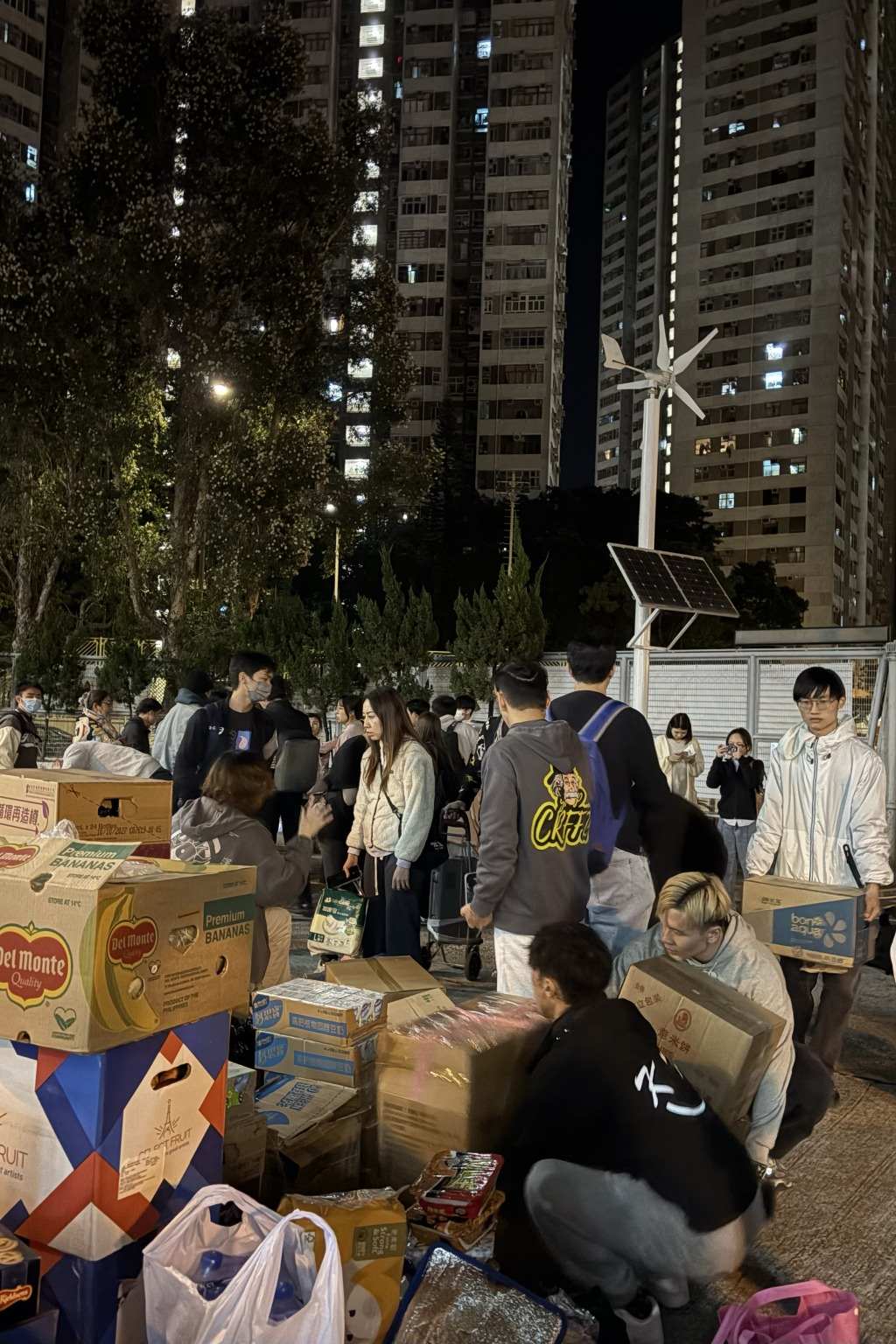 在消防隊徹夜救援的同時,宏福苑附近的中華基督教會馮梁結(jié)紀念中學氣氛也比平時更為緊張,在這個臨時安置點,熱心市民不斷扛著成箱的飲用水、干糧涌入,有人則提著大包小包的被褥、毛毯、厚外套。住在元朗區(qū)的陳先生說,事發(fā)后他挨個給安置點打電話,晚上9點下班后直接開車去采購物資,來來回回已經(jīng)跑了4個點位運輸,“能幫就幫,公民責任”。
