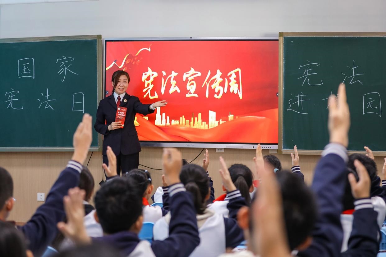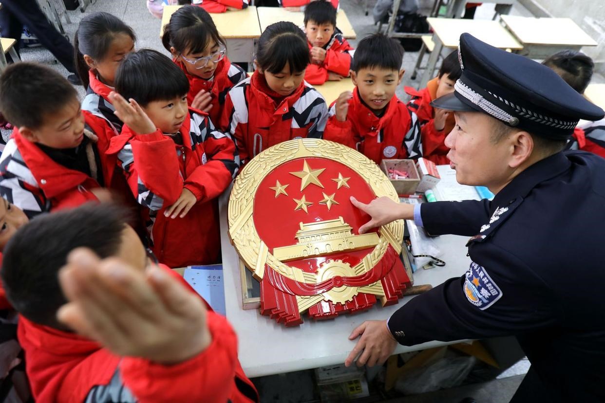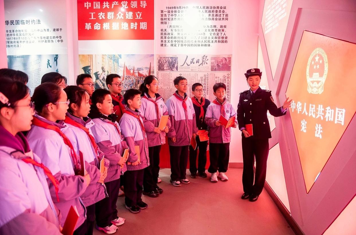 12月3日,安徽省馬鞍山市雨山區(qū)雨山實(shí)驗(yàn)學(xué)校,司法干警給學(xué)生解讀憲法核心內(nèi)容。(工人日報通訊員 歐宗濤 攝)