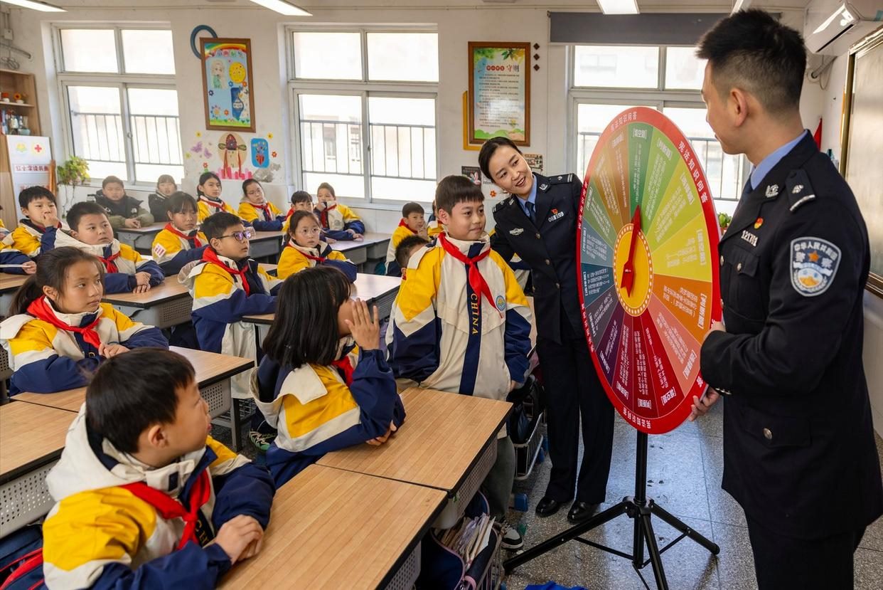 12月2日,安徽省舒城縣公安局網(wǎng)監(jiān)大隊(duì)聯(lián)合五顯派出所走進(jìn)五顯鎮(zhèn)中心學(xué)校課堂,為同學(xué)們帶來了一堂沉浸式、互動式的法治教育課。(工人日報通訊員 王可海 攝)