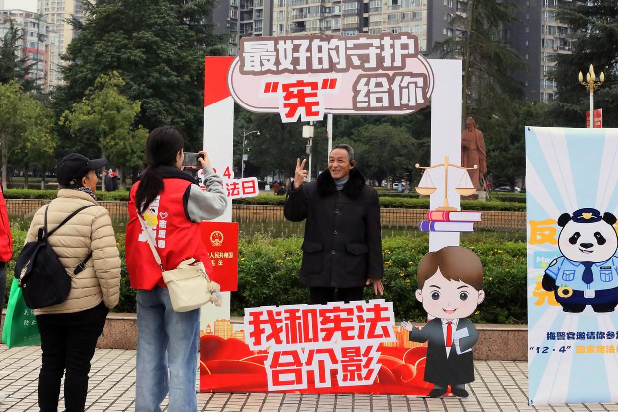 12月4日,四川省樂山市市中區(qū)司法局普法宣傳志愿者在樂山新廣場開展“憲法宣傳日”活動,市民在法治打卡框合影留念。(工人日報通訊員 李華時 攝)