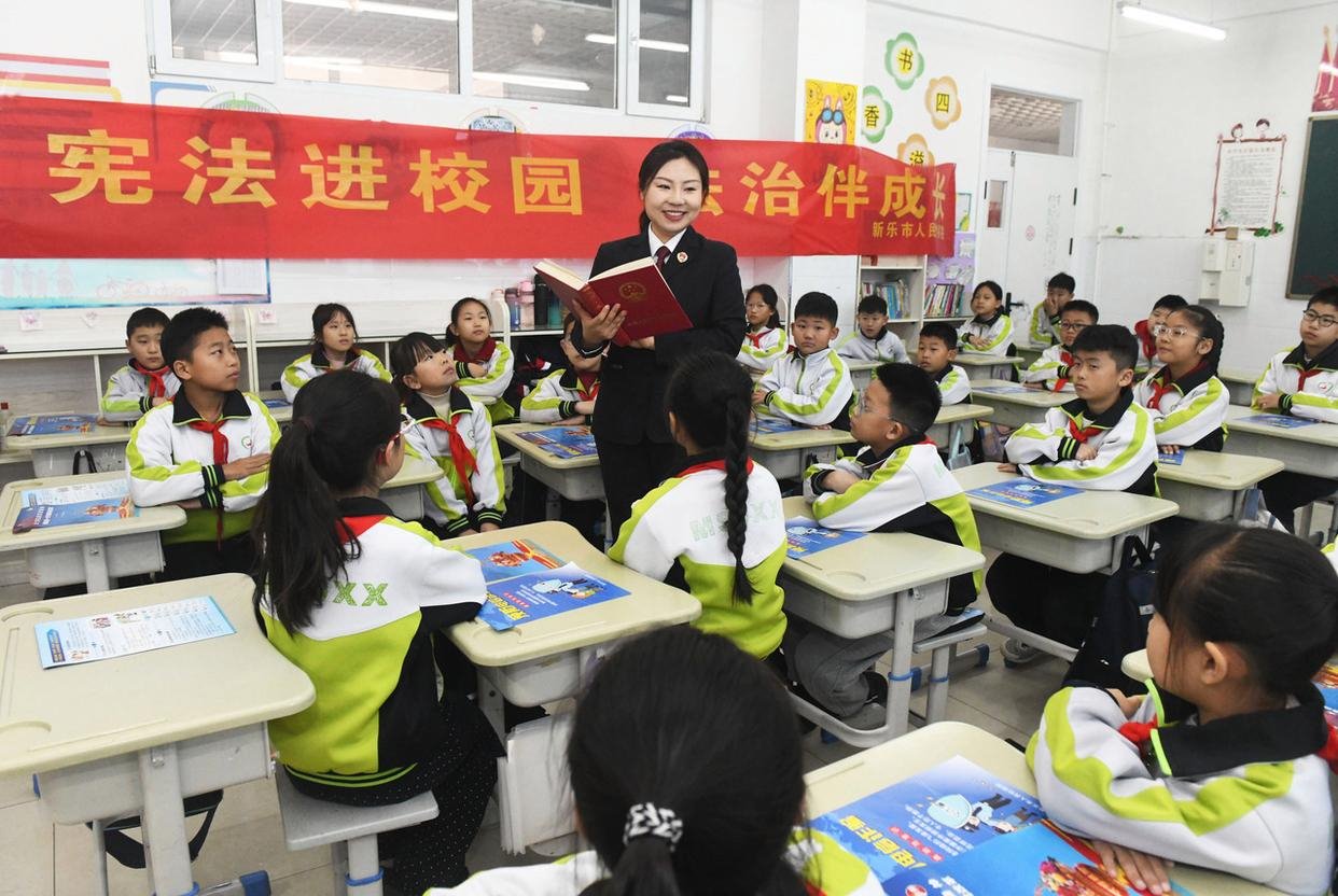 12月4日,在河北省石家莊市欒城區(qū)凌空橋路小學(xué),欒城區(qū)法院的工作人員為學(xué)生們普及憲法知識。(工人日報通訊員 李明發(fā) 攝)