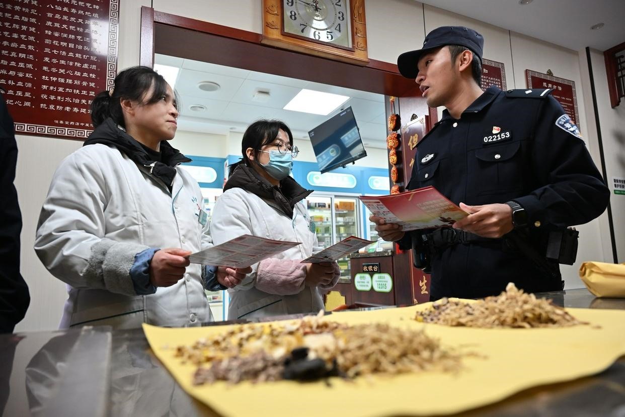 12月2日,安徽省馬鞍山市含山縣公安局林頭派出所聯(lián)合鎮(zhèn)司法所,將“法治課堂”搬進(jìn)菜市場門口,向過往群眾講解《中華人民共和國憲法》《中華人民共和國民法典》等法律法規(guī)。(工人日報通訊員 馮善軍 攝)