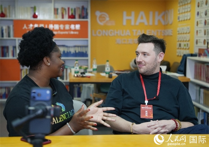 尼日利亞籍創(chuàng)業(yè)者馬爾維斯·烏福馬杜(左一)接受人民網(wǎng)外專柯明可采訪。人民網(wǎng)記者 符武平攝