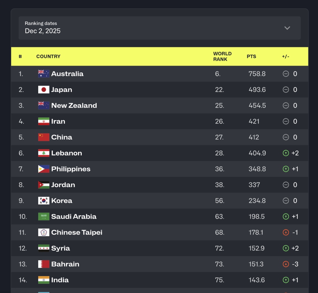 亞洲球隊(duì)中,排名最高的仍然是澳大利亞隊(duì)(世界排名第六),其次分別為日本隊(duì)、新西蘭隊(duì)和伊朗隊(duì),中國(guó)隊(duì)位列亞洲區(qū)第五。