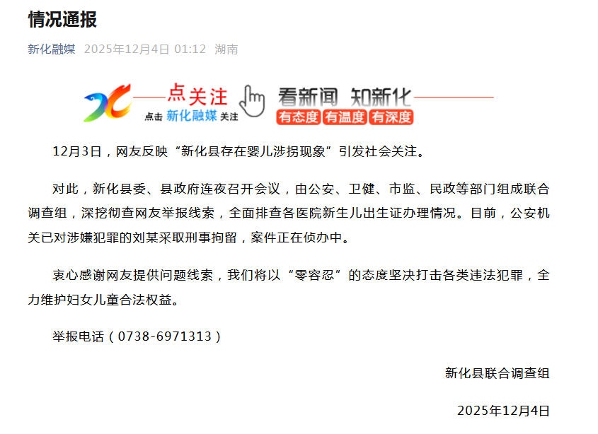 中新網12月4日電 針對網友反映的“新化縣存在嬰兒涉拐現象”,湖南省婁底市新化縣聯合調查組12月4日發(fā)布情況通報稱,新化縣委、縣政府連夜召開會議,由公安、衛(wèi)健、市監(jiān)、民政等部門組成聯合調查組,深挖徹查網友舉報線索,全面排查各醫(yī)院新生兒出生證辦理情況。