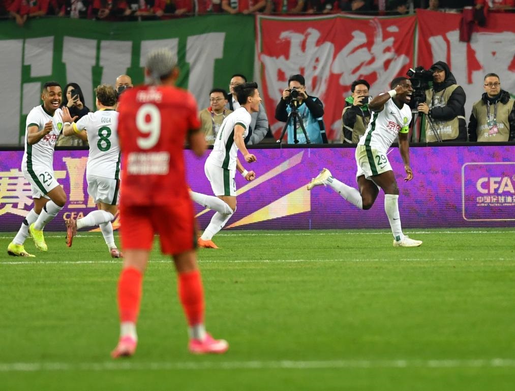 12月6日,北京國安隊球員法比奧(右一)在比賽中慶祝進球。新華社記者 李嘉南 攝