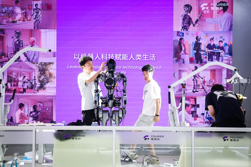 2025世界人工智能大會(huì)上,傅利葉工程師調(diào)試人形機(jī)器人。解放日報(bào)記者 海沙爾 攝