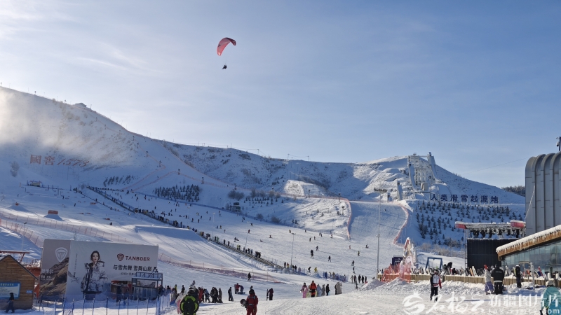 銀雪之上,滑翔傘馭風漫舞、滑雪者踏雪飛馳,將軍山國際滑雪度假區(qū)的冰雪天地滿是熱血與自由。石榴云/新疆日報記者 張婷攝