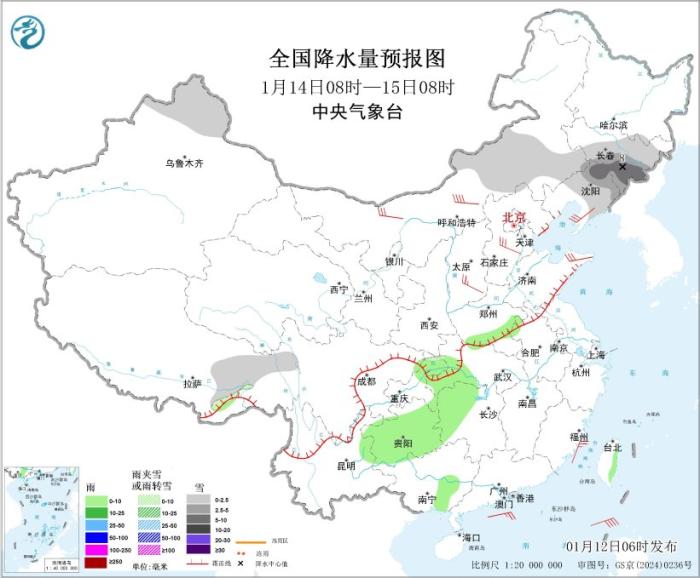 圖4 全國(guó)降水量預(yù)報(bào)圖(1月14日08時(shí)-15日08時(shí))。圖片來源:中央氣象臺(tái)網(wǎng)站