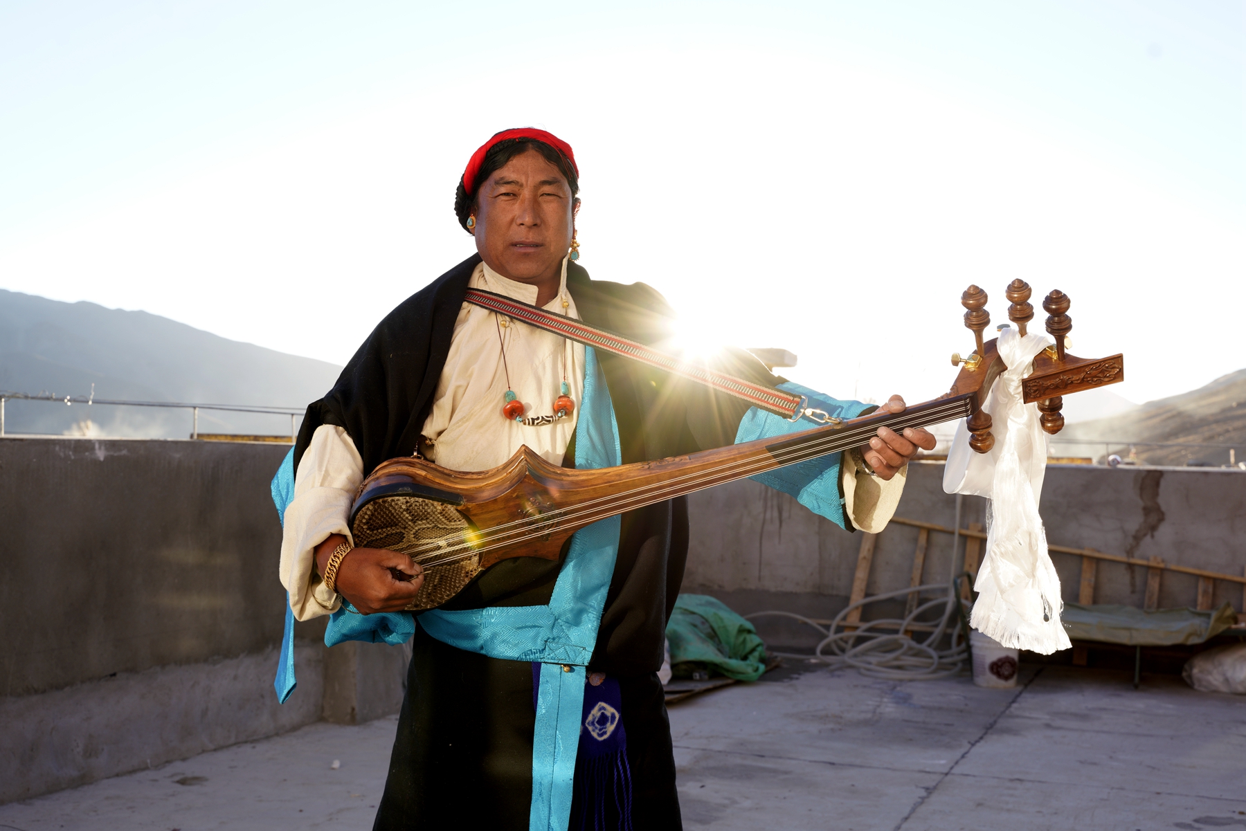 拍攝日,陽(yáng)光清澈,天空湛藍(lán)。村民們穿上了最隆重的藏裝,女人發(fā)間的珊瑚與綠松石流淌著溫潤(rùn)的光澤。許多老人被子女小心攙扶而來(lái),他們的眼神里有局促,有陌生,也有隱約的期待。