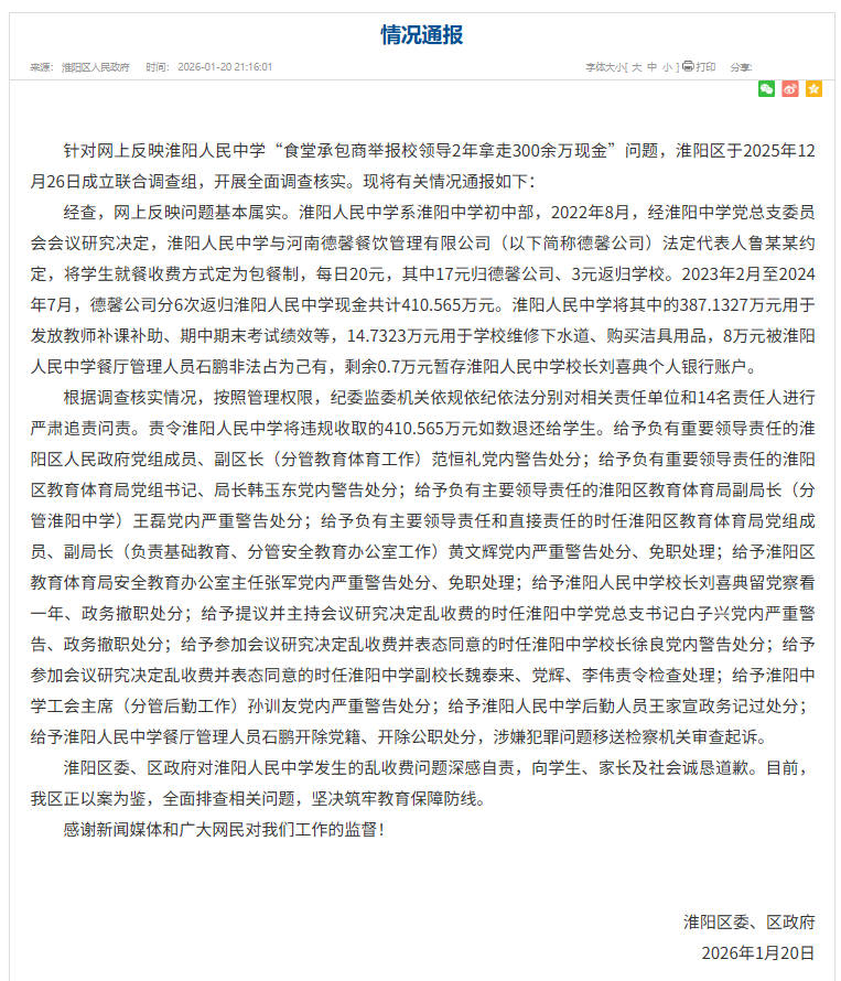 中新網(wǎng)1月21日電 據(jù)周口市淮陽區(qū)人民政府官網(wǎng)消息,近日,淮陽區(qū)委、區(qū)政府發(fā)布通告表示,針對(duì)網(wǎng)上反映淮陽人民中學(xué)“食堂承包商舉報(bào)校領(lǐng)導(dǎo)2年拿走300余萬現(xiàn)金”問題,淮陽區(qū)于2025年12月26日成立聯(lián)合調(diào)查組,開展全面調(diào)查核實(shí)?,F(xiàn)將有關(guān)情況通報(bào)如下: