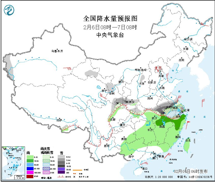 2月6日08時(shí)至7日08時(shí),新疆南部、甘肅河西和中南部、陜西中南部、湖北北部、河南南部、安徽中南部、江蘇中南部、上海、浙江北部等地部分地區(qū)有小到中雪或雨夾雪,其中,陜西中部、河南南部、安徽中南部、江蘇中南部、浙江北部等地部分地區(qū)有大到暴雪或雨夾雪,安徽西南部局地大暴雪(20~21毫米)。江漢東部、江南大部、重慶東北部、華南北部、廣西西南部、廣東東南部、臺(tái)灣島等地部分地區(qū)有小到中雨,其中,浙江北部等地部分地區(qū)有大雨(25~28毫米)。黑龍江東北部、青海東部、新疆南疆盆地等地部分地區(qū)有4~6級(jí)風(fēng),陣風(fēng)6~7級(jí),東海大部、臺(tái)灣海峽將有6~8級(jí)風(fēng)、陣風(fēng)9級(jí),黃海中部和南部、臺(tái)灣以東洋面、南海東北部將有5~7級(jí)風(fēng)、陣風(fēng)8級(jí)。
