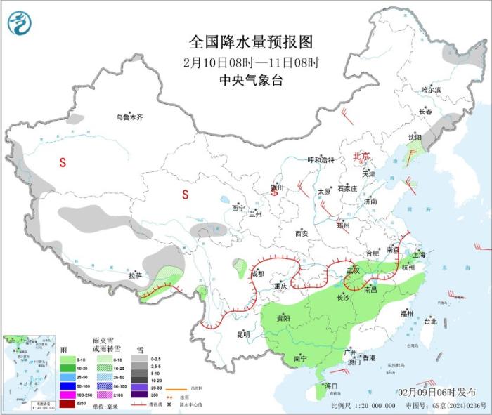 2月10日08時至11日08時,新疆南疆西部山區(qū)、西藏北部和南部、青海西南部和東部、黑龍江東北部、吉林東部、遼寧東部和南部、山東半島北部等地部分地區(qū)有小雪或雨夾雪。江淮西部、江南大部、華南中西部及貴州大部、海南島東部等地部分地區(qū)有小雨。新疆南部、青海中部、內(nèi)蒙古西部、甘肅中西部、寧夏、陜西中北部等地的部分地區(qū)有揚(yáng)沙或浮塵天氣。內(nèi)蒙古中部、遼東半島、陜西北部、山西南部、山東半島、河南中部等地部分地區(qū)有4~5級風(fēng);東海、巴士海峽、南海東部和西南部海域?qū)⒂?~6級、陣風(fēng)7級的大風(fēng)(見圖3)。