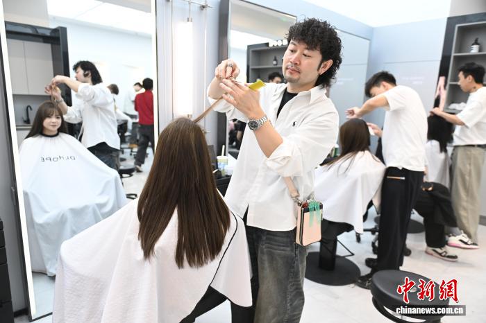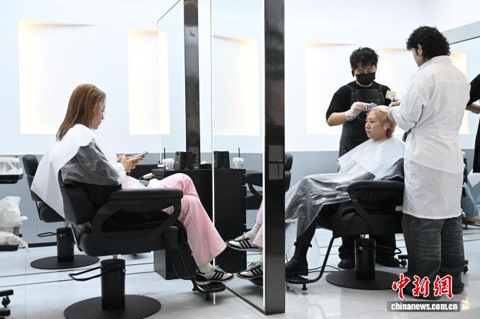 理發(fā)師為年輕顧客染發(fā)。 中新網(wǎng)記者 劉文華 攝
