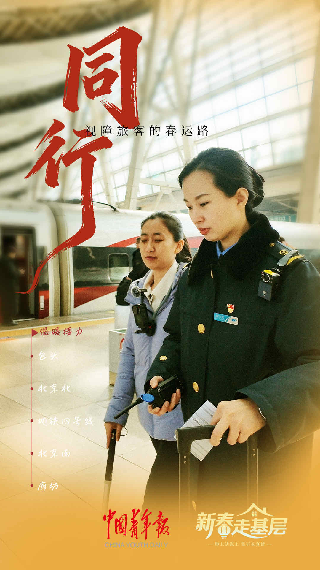 這一路,全程參與接力的鐵路、地鐵工作人員,有十余人。北京北站的工作人員說,春運期間,日均服務(wù)重點旅客50至100人。